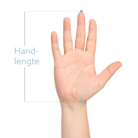 Messen Sie den Abstand zwischen der Kante Ihres Handgelenks und der Spitze Ihres Mittelfingers. Wenn dieser kleiner als 16,5 cm ist, haben Sie Größe S. Wenn er größer als 18,5 cm ist, benötigen Sie Größe L.