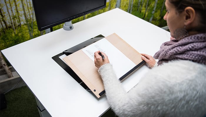 Anstelle eines harten, erhöhten Randes auf der Vorderseite des Blattes haben wir unsere Dokumentenhalter mit einer weichen Handgelenkstütze aus Schaumstoff ausgestattet. Während Sie Notizen machen, ruht sich das Handgelenk darauf. So können Sie bequem schreiben, ohne lästigen Druck auf die Handgelenke.