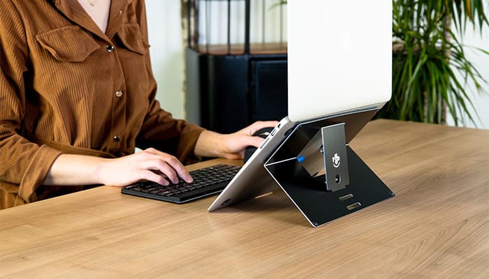 Plaats de standaard zo hoog, dat het scherm op of net iets onder ooghoogte komt. Zo neem je automatisch een rechte houding aan. Let op: maak altijd gebruik van een los toetsenbord en muis om ergonomisch te werken.